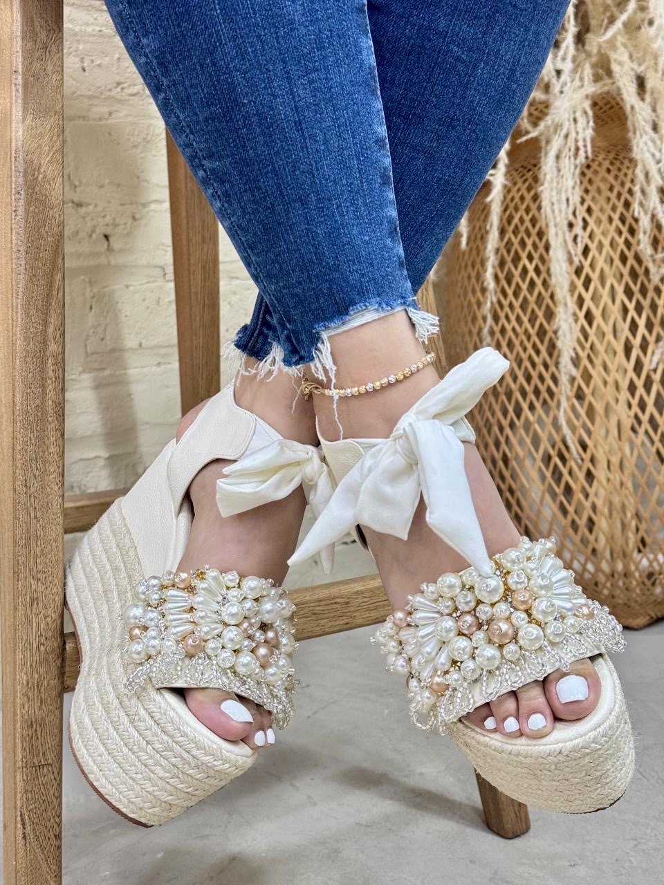 Plataformas con tejido trenzado dorado y amarre en cinta beige ✨🌾