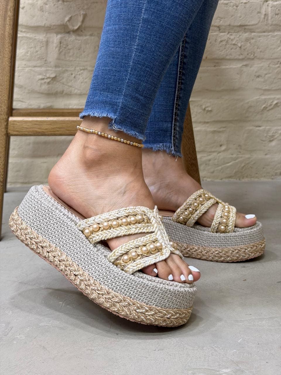 Sandalia plataforma con capellada tejida y perlas incrustadas 🤍✨